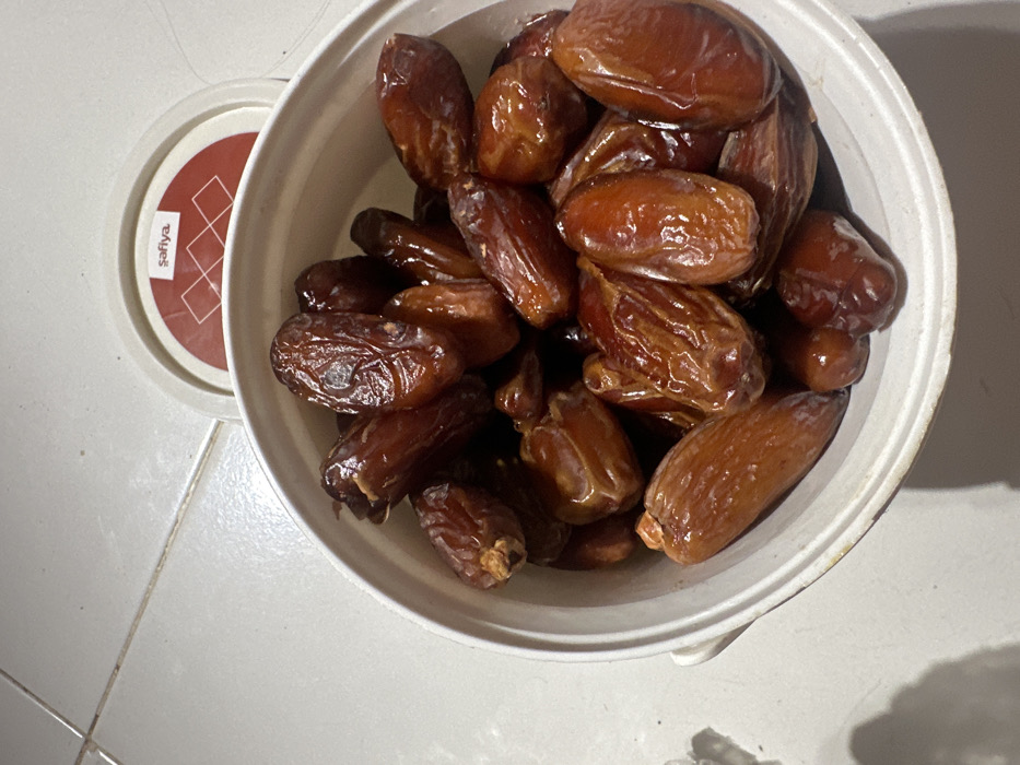 - "The image displays a white, circular plastic bowl overflowing with approximately 40-50 dark brown dates" by FM-dya8j2, licensed under CC BY 4.0