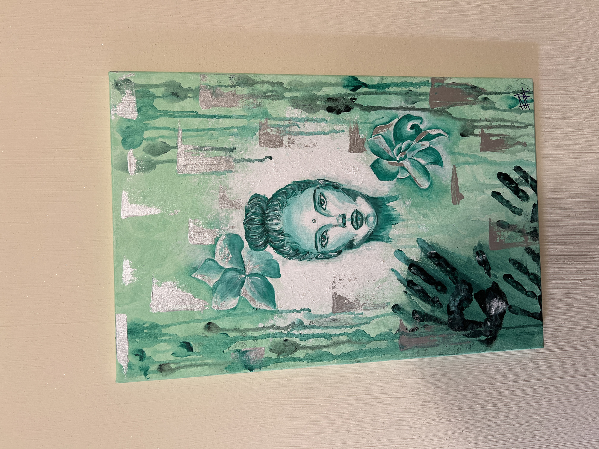 horizontally oriented painting on a canvas. The painting features a pale green background with abstract elements like stripes, squares in silver and gray, and dripping paint effects. A central element is a face rendered in shades of teal with a bun hairstyle. Flanking the face are two teal floral elements on the left and right. On the right lower side of the painting, there are dark teal, possibly hand-painted, organic shapes. The painting is mounted on a light cream-colored wall. There is no visible indication of the location being Smolyan, Bulgaria.