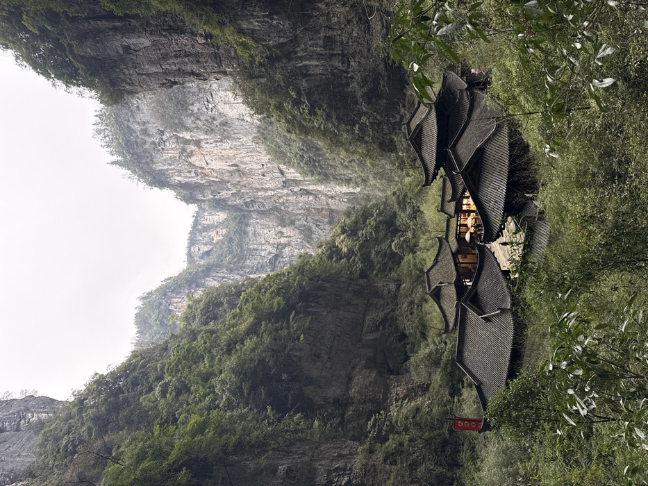 - "This image displays a complex of traditional Chinese-style buildings situated within a deep karst gorge in the Tiankeng Three Bridges (Tiansheng Sanqiao) Scenic Area, Wulong District, Chongqing, China" by FM-K0Kp62, licensed under CC BY 4.0