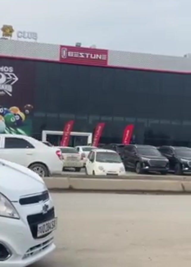 street scene in front of a building. The building has a sign that reads "BESTUNE" and also appears to have a billiard club. There are several cars parked in front of the building. The camera pans to the right, showing different cars passing by on the road. The sky is overcast.