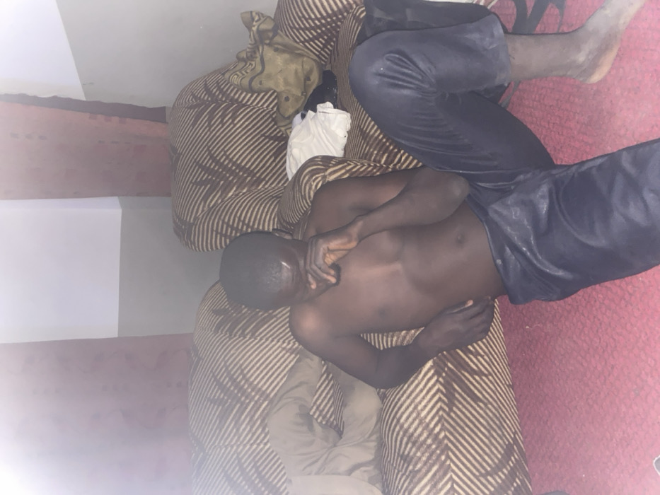 A dark-skinned person rests on a patterned couch. The individual is shirtless, wearing dark-colored pants. Their face is obscured by their hand. Another person is partially visible on the couch, also wearing dark clothing. A red rug is on the floor, and a partial view of a curtain is seen on the left side. The picture is taken at an angle.