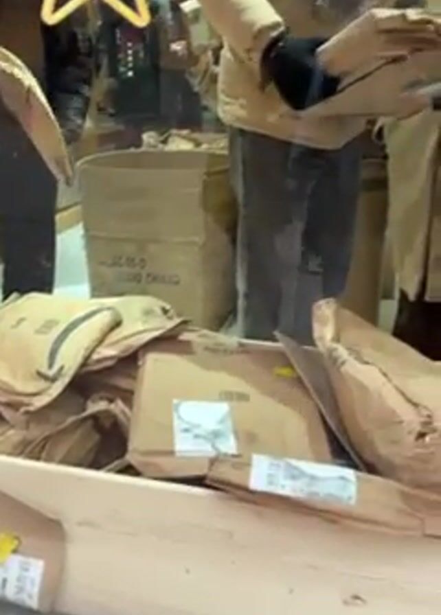 From a street-level perspective, the scene captures a display of Amazon packages within a store window. A wooden crate, seemingly overflowing with parcels bearing the Amazon logo, is visible through the glass. Several individuals are observed from the chest up, engaging in the act of transferring the packages from the crate. They are clad in winter attire, including puffy jackets and gloves. The store window display also features decorative elements, such as a lit star and greenery. The camera pans slightly, revealing a larger box with indiscernible writing on it.