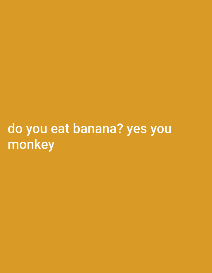 The image displays white sans-serif text against a solid mustard-yellow background. The text, rendered in lowercase letters, reads: "do you eat banana? yes you monkey". This text is positioned in the lower-left quadrant of the frame. No individuals, objects, or physical environment, including any city administration building or specific geographic location like Stepnogorsk, Kazakhstan, are depicted within the image. The scene consists solely of textual content on a uniform color field.