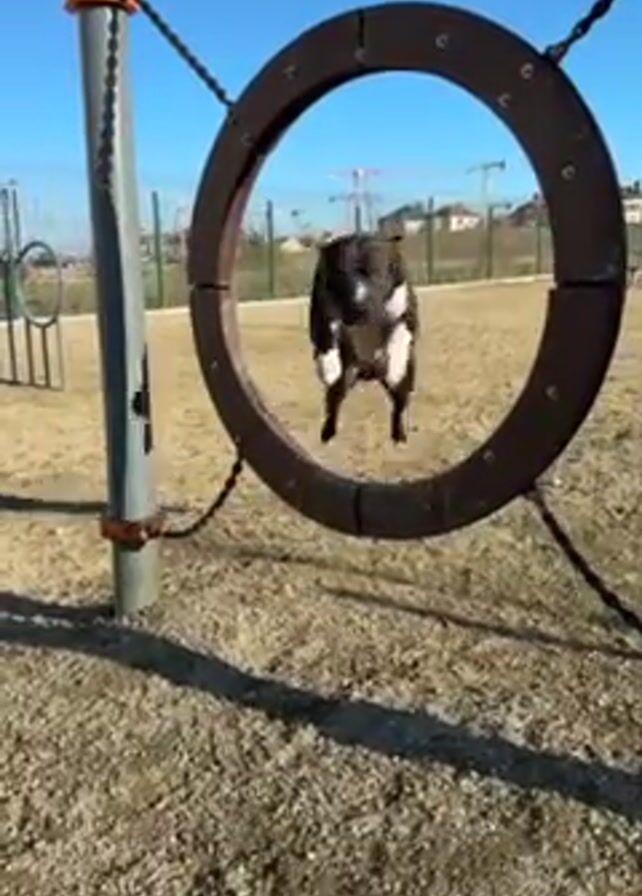 - "black-and-white dog running through a circular obstacle at a dog park" by FM-Q0AMB2, licensed under CC BY 4.0