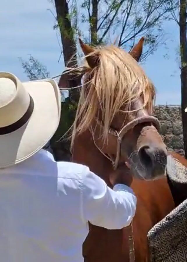 two men preparing a horse. The horse is light brown with a blonde mane. The first man is wearing a white long-sleeved shirt and a white hat with a dark band. He's holding the horse by its halter. The second man is wearing a similar hat, a white long-sleeved shirt, and a dark vest. He is placing a gray blanket or pad on the horse's back. The scene takes place outside with trees and a stone wall visible in the background. The sky is blue.