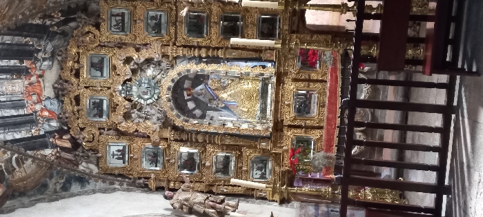 - "An ornate, gold-framed altar dominates the scene, embellished with smaller mirrored frames and a central figure" by FM-J1hWQ2, licensed under CC BY 4.0