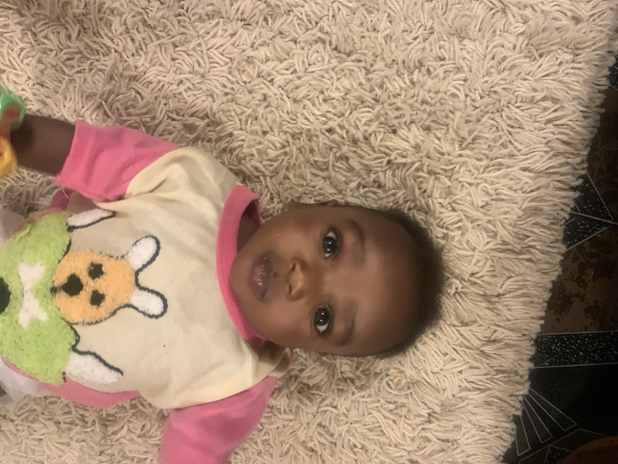 A baby lies on a cream-colored, shag rug. The baby is wearing a pink and beige long-sleeved shirt with an animal cartoon on the front. The baby's location and background is not available in the image, therefore it's impossible to determine the exact location in Barakin Akawo, Nigeria.