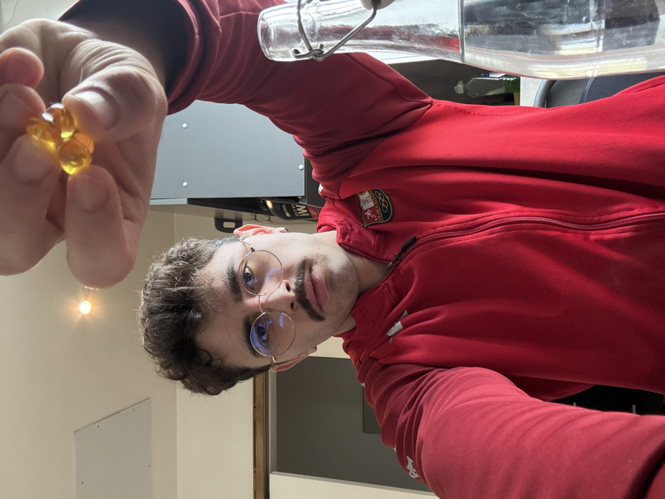 The scene is set indoors, within a residential or personal space in Lion-sur-Mer, France. A male subject, appearing to be in his mid-20s to 30s, occupies the center-left of the frame, facing directly forward. He has dark, curly hair, a mustache, and wears round, gold-rimmed spectacles. His attire consists of a red zippered athletic jacket, featuring a multi-colored patch on the right pectoral area that displays a crest, Olympic rings, and "MC CD" text. His right hand is elevated and positioned centrally, presenting three or four amber-colored, oval gel capsules held between his thumb and forefinger. To the subject's right, a clear glass bottle with a metal swing-top closure, partially filled with clear liquid, is visible on a surface. In the background, behind the subject's left shoulder, a dark container with white text, including "GOLD STANDARD WHEY," is visible. Overhead, a ceiling panel contains a recessed light fixture emitting a distinct point of light. The overall lighting is bright, consistent with an interior environment.