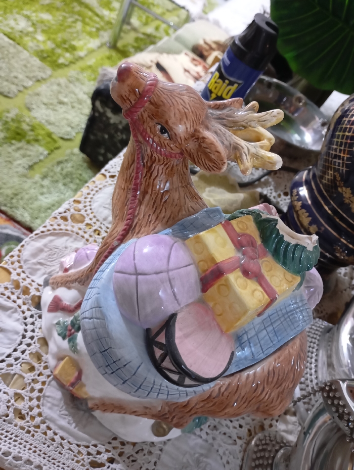 The scene depicts an indoor setting in Nasiriyah, Iraq. A brown ceramic reindeer figurine, featuring light brown antlers and a red harness, is centrally positioned on a white crocheted lace tablecloth. The reindeer is depicted carrying or pulling a light blue bundle filled with miniature objects, including a light pink basketball, yellow rectangular gift boxes with red ribbons, and a pink drum with black trim. To the right of the figurine, a dark blue decorative object with gold patterns and a reflective silver item are partially visible. In the background, a blue aerosol can labeled "Raid" stands upright next to a dark green artificial leaf. A light green patterned rug or carpet is visible further in the background.