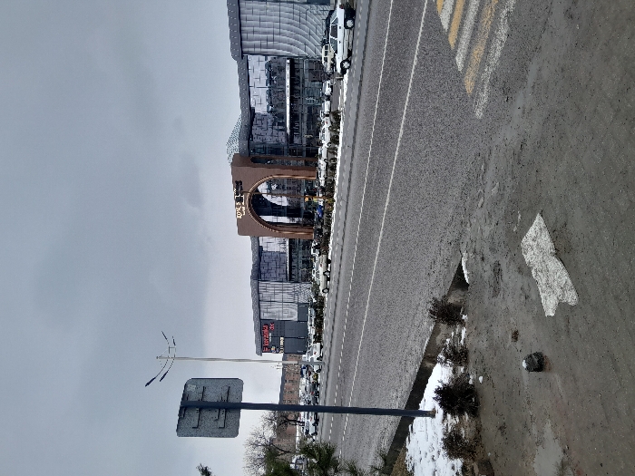 A street view with a cloudy sky. A wide avenue stretches alongside a sidewalk, with parked cars lining the buildings. A large, modern building complex dominates the background, featuring a prominent archway entrance. Streetlights and signage add to the urban landscape. Patches of snow and bare vegetation border the sidewalk, contrasting with the asphalt road.
