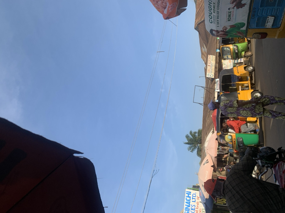 The image depicts a bustling street scene in Narayi, Nigeria, under a clear blue sky traversed by multiple power lines