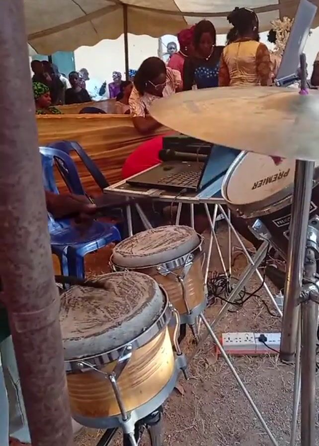 musical performance taking place under a large white tent. In the foreground, a set of bongo drums is visible. A man wearing a green t-shirt and jeans is seated to the left of the drums, presumably the musician. Behind the drums, a small table holds a laptop. Several women are visible in the background, some wearing colorful dresses. The setting appears to be outdoors on sandy ground. There is a microphone stand and a power strip as well.