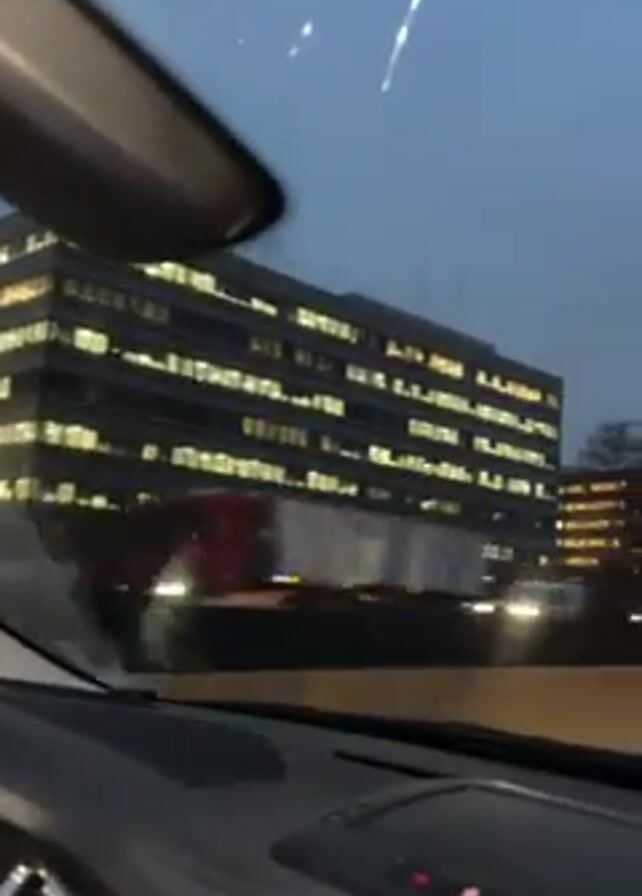view from inside a car driving on a road at dusk or early evening. Several large buildings with illuminated windows are visible in the background, along with trees and other vehicles on the road. The sky is overcast. The car appears to be moving in light traffic.