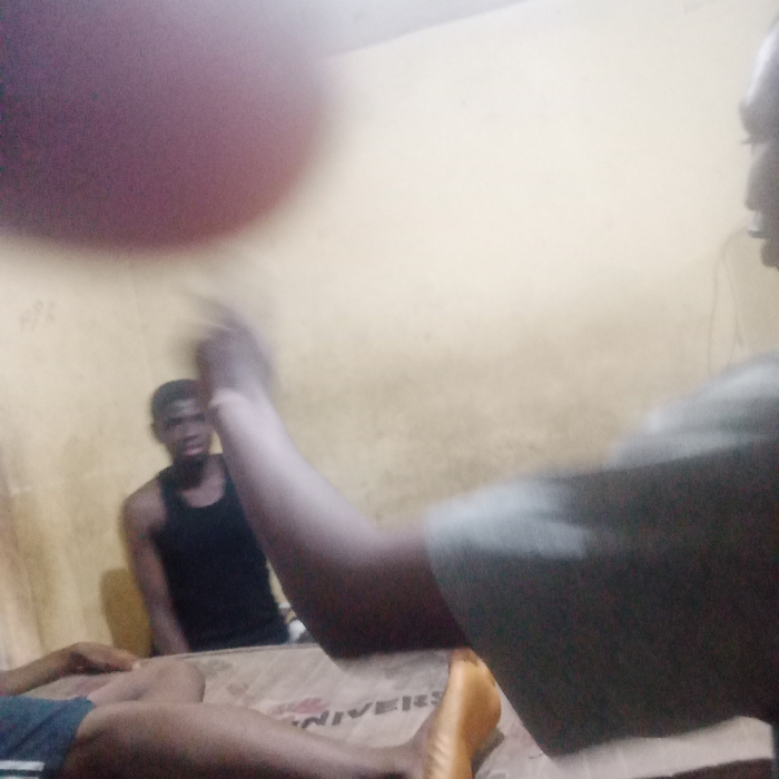 In a sparsely lit room, two men are visible on a bed. One man, seated in the background and wearing a black tank top, looks towards the foreground. Another man's arm and shoulder obstruct the view in the foreground, while his legs extend out on the bed. The room's wall is a dull, yellowish color. There's a large blurry object, perhaps a hand or lens obstruction, at the top left.