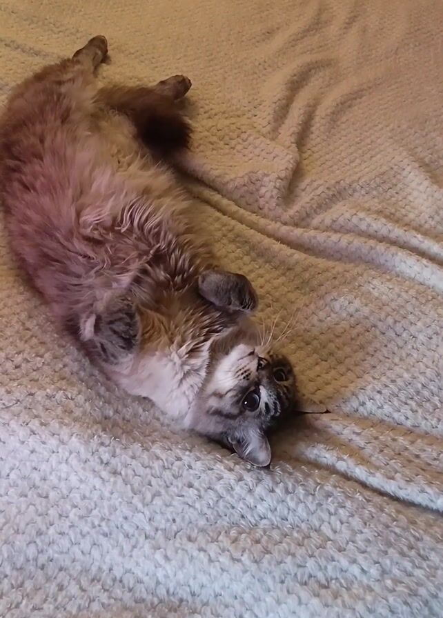 - "A fluffy, light-brown cat is lying on its back on a light-colored, textured blanket" by FM-YVp303, licensed under CC BY 4.0