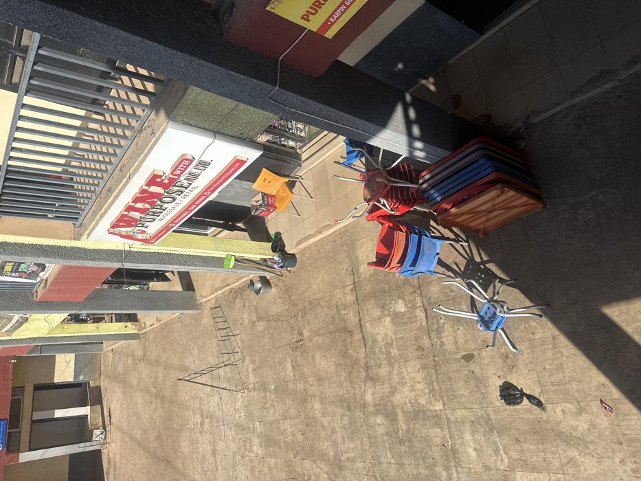 The image depicts an outdoor concrete courtyard or plaza located at Plot 10, Rayfield Road, opposite NTA Jos, in Jos, Plateau State, Nigeria. The scene is illuminated by strong sunlight, casting distinct shadows. The foreground features a collection of stacked plastic chairs in red and blue, alongside stacks of tables with colorful edges (predominantly brown/orange tops). One blue plastic chair with silver legs lies on its side, appearing partially disassembled or broken. A black plastic bag and a small piece of trash are on the concrete ground. To the right, a multi-story commercial building forms one side of the courtyard. Its facade is characterized by yellow, red, and dark grey/black pillars and wall sections. A large white sign, "WINE WITH PURPOSE NIG. LTD. WHOLESALE / RETAIL," is prominently displayed on the upper part of the ground floor, explicitly stating the address: "Plot 10, Rayfield Road, Opposite NTA Jos." Below this sign, near the entrance, an orange plastic chair stands next to two buckets (one grey, one black) and two brooms leaning against the wall. A red carton labeled "VOLTA" is visible beside the orange chair. Above this level, a balcony with dark grey vertical bar railings is present. Further to the right, a partial sign reads "PUR" and "KAFIN G," indicating another adjacent business. In the middle distance of the courtyard, a triangular metal frame, possibly a clothes drying rack or display stand, casts a long shadow across the cracked concrete. In the background, another commercial building with a light-colored entrance is visible. No people are present in the scene, which appears static and devoid of active human interaction.
