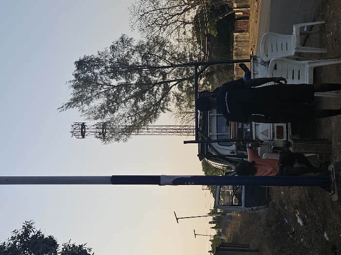 Two men work from the back of a small white truck. One man wears black, the other orange. Equipment extends upwards from the truck bed. Two white plastic chairs sit on the roadside near the truck. Behind the truck is a low brick wall and some greenery. In the distance, a tall metal tower stretches into the sky. A striped pole stands in the foreground, and smaller poles with single crossbars line the road in the distance.