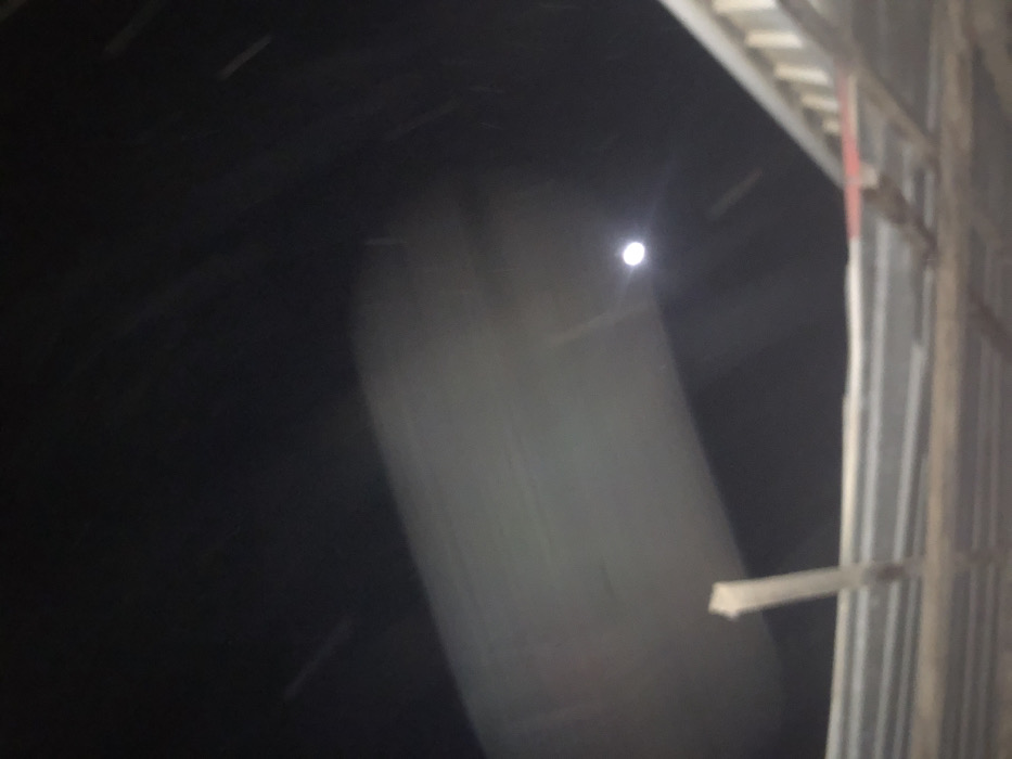 dimly lit interior, possibly a barn or shed. A large, indistinct, cylindrical shape is illuminated by a single light source above. The right side of the frame features corrugated metal siding and wooden beams, indicating the structure's construction. The overall tone is dark and somewhat mysterious.