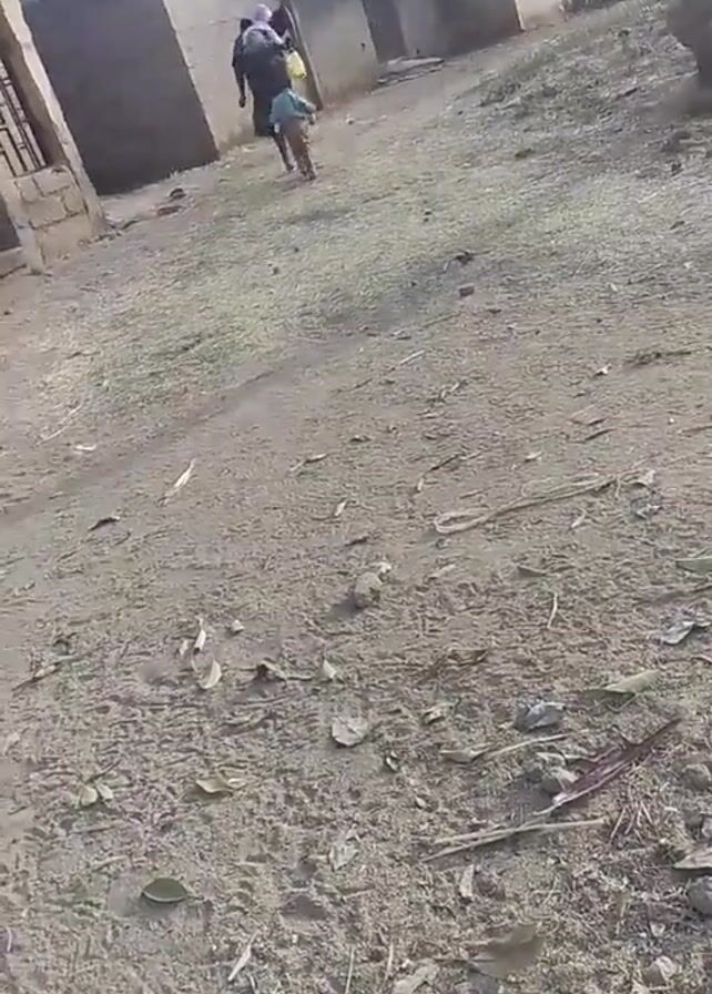woman and a child walking on a dirt path between buildings. The woman is carrying something on her head and the child is walking beside her. The ground is covered in dirt, leaves, and small twigs. The buildings in the background appear to be simple, one-story structures.