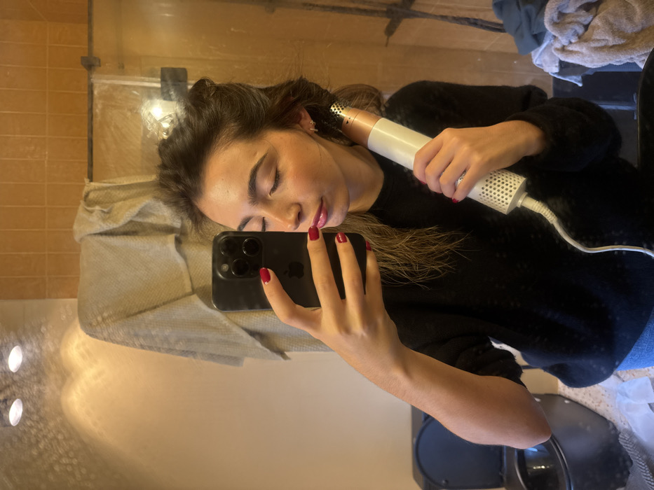 A young female is depicted in a mirror selfie within a bathroom setting in Porto, Portugal. She holds a black smartphone with a visible triple camera array in her left hand, which has red nail polish on the fingernails. Her right hand operates a white and rose gold hair styler, holding it to the right side of her head, actively engaged in hair styling. The subject has dark hair, partially pulled up, and her eyes are partially closed. She is wearing a dark, textured long-sleeved top and blue jeans are visible below. To the left in the reflection, a black toilet with an open lid is present. The background reveals light brown square wall tiles, an overhead light fixture with two spotlights, and a light-colored towel draped over a bar. Additional towels or fabric are visible on the right side of the frame.