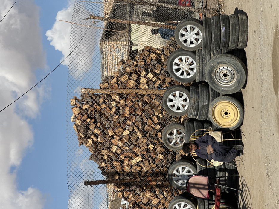 A roadside scene shows a large pile of stacked firewood behind a chain-link fence. Stacks of tires, some with silver rims, are lined up. A person in dark clothing sits on a chair surrounded by tires. Additional chairs and a car body are present. The sky is partially cloudy.