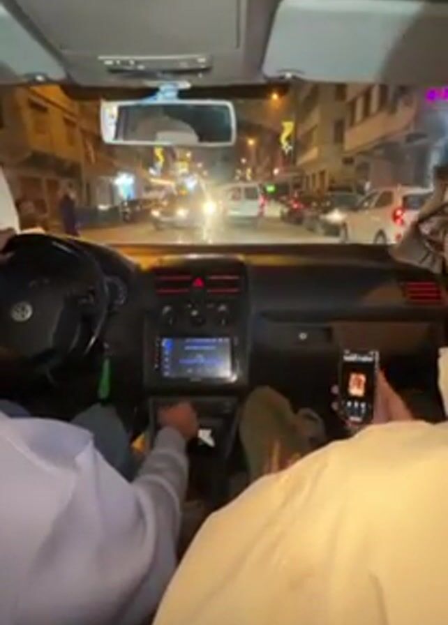view from inside a car at night. There are two people in the car, the driver and a passenger. The driver is wearing a blue sweater and jeans, and the passenger is wearing a white jacket. The passenger is holding a smartphone. The car is driving down a street lined with buildings. There are other cars on the road. The music is playing loudly in the car.