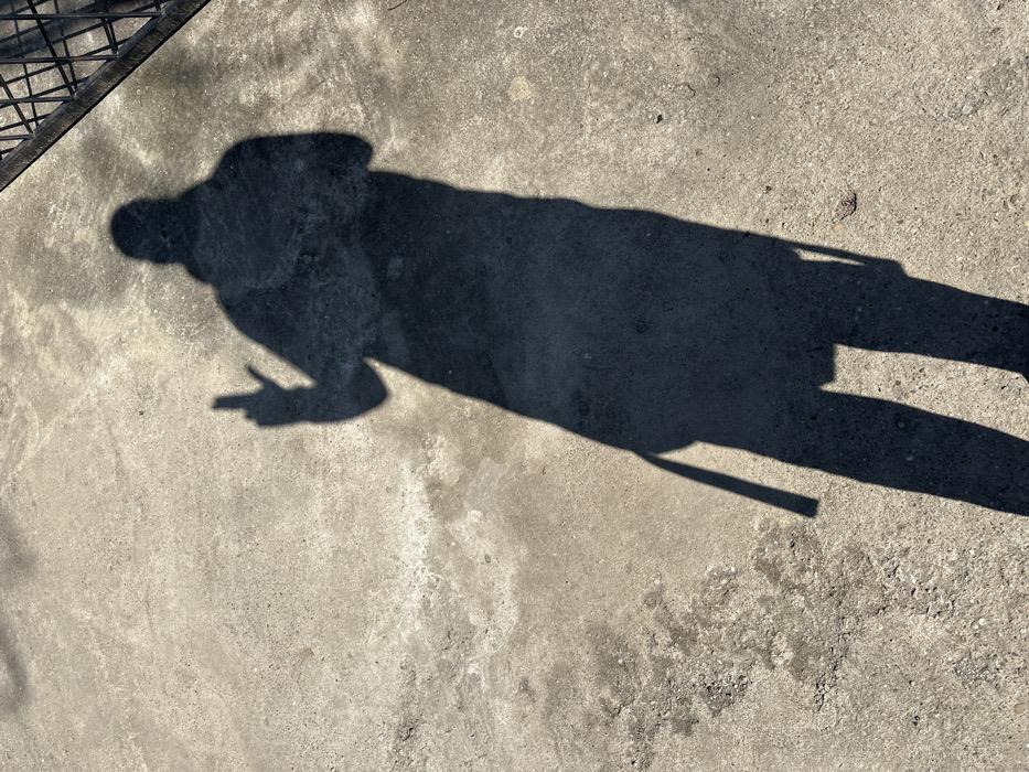 The image depicts a dark human shadow cast on a textured concrete surface under direct sunlight