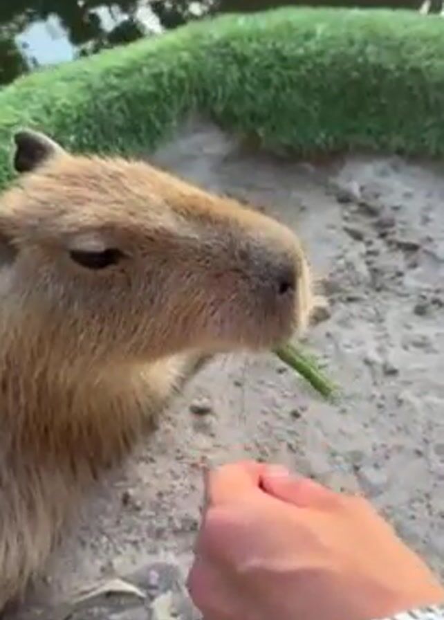 capybara being fed by a person. The capybara is sitting on sandy ground near a body of water and a grassy bank. Two different people are shown feeding the capybara blades of green grass. In the first scene, a person wearing a silver watch feeds the capybara. In the second scene, a different person with manicured nails feeds the capybara. The capybara chews the grass with a relaxed expression.