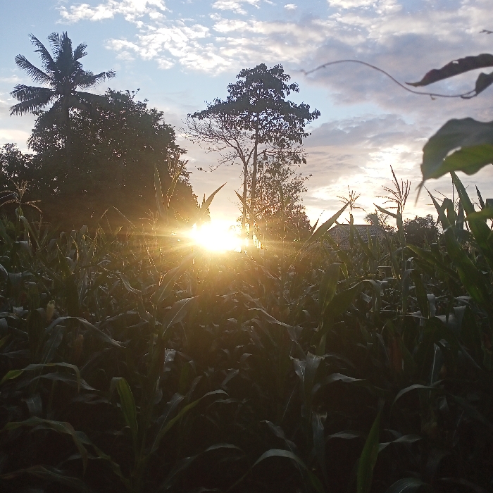 A vibrant sunrise illuminates a field of corn. The sun, low on the horizon, casts a bright, golden glow through the corn stalks. Silhouetted trees, including a palm, frame the scene. A cloudy sky adds depth to the background. Corn plants dominate the foreground.