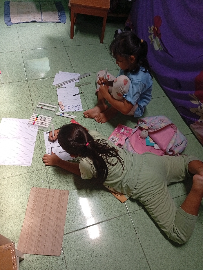 Two young females are depicted indoors on a light green tiled floor in Kecamatan Pati, Indonesia, engaged in drawing activities