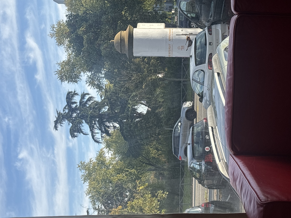 The image displays an outdoor urban scene in Strasbourg, France, captured from a low perspective, with a red upholstered surface visible in the immediate foreground. The mid-ground features a street or parking area with multiple vehicles. A black Volkswagen Polo hatchback, identifiable by its badge and a red 'A' sticker (signifying a novice driver), is visible from the rear, parked to the left. The roof and upper body of a silver vehicle are directly in front of the viewer. To the right of the Polo, a white Seat Ibiza two-door hatchback is also visible from the rear. Further back on the road, a silver SUV is present. On the far right, a partial view of a dark-colored vehicle is observed. A prominent white cylindrical column, characteristic of a Morris column, stands on the right, topped with a decorative domed cap. French text, including "AFFICHAGE INTERDIT" (posting forbidden) and "PÔLE SUD," is visible on its surface. The background is dominated by a dense line of trees featuring green and early autumnal foliage, indicating a park or green space beyond the road. A tall, distinct conifer with an irregular silhouette is centrally positioned among these trees. Above the treeline, the sky is clear blue with scattered cirrus clouds. No individuals are visible in the frame.