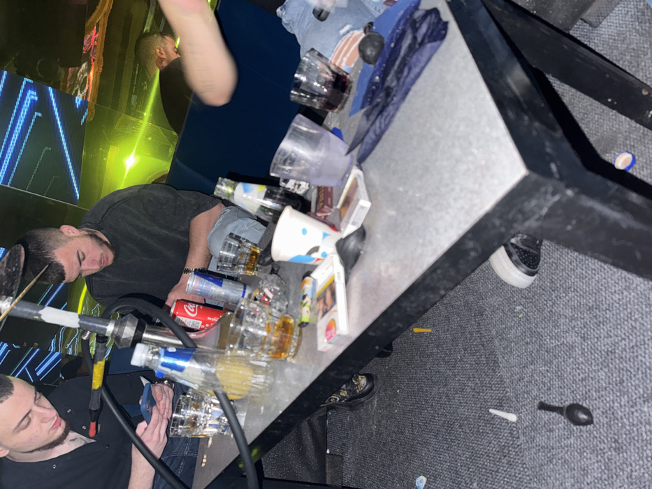 The image depicts an indoor scene within a dimly lit establishment, likely a lounge or nightclub. The specific location within the city of Sliven, Bulgaria, is not discernible from the visual information. In the foreground, a rectangular table with a light grey top and black frame is heavily cluttered. Objects on the table include: several clear glasses, some containing amber liquid consistent with spirits and one with dark red liquid; an empty clear glass water bottle; a red Coca-Cola can; a silver Red Bull can; another glass bottle; an ashtray containing multiple cigarette butts; a black hookah pipe with a hose extending towards the left; a white paper cup with colorful markings; multiple cigarette packs (one identifiable as Marlboro); a blue fabric item; and a dark, spherical object. Three individuals are prominently visible, with glimpses of a fourth. To the far left, a young male with short dark hair, dressed in a black collared shirt and blue jeans, is engrossed in a mobile phone held in his hands. Center-frame, another young male with short dark hair, wearing a dark long-sleeved shirt and light blue jeans, looks downwards towards the table. A bracelet is visible on his left wrist. To the immediate right, a blurred arm and hand are partially visible, suggesting another person, while a fourth individual's head is dimly visible in the background, facing away and leaning forward. The floor beneath the table is covered with dark grey carpeting and shows scattered debris, including a yellow plastic tip, a white plastic tip, and a small black object resembling a hookah mouthpiece. The background features dark blue upholstered seating and walls adorned with reflective surfaces that display vibrant blue and yellow horizontal light patterns, suggesting a modern entertainment venue.