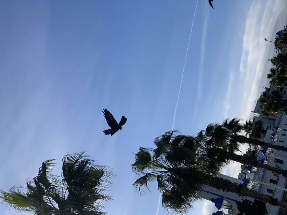 The image depicts an outdoor daytime scene in M'diq, Morocco, characterized by a clear blue sky with two distinct white contrails. In the upper left-center, a large, dark-silhouetted bird is captured mid-flight, wings fully extended. The tip of a second, similar dark bird's wing is visible in the lower right corner, also in flight. The foreground and mid-ground are dominated by numerous tall palm trees with dark, fanned fronds, suggesting backlighting. Below and behind the palm trees, a row of white buildings with blue window or door frames is visible, indicative of local architecture. A prominent white tower-like structure with blue decorative elements, possibly a minaret, stands on the left side, partially obscured by palm fronds. A series of ornate streetlights with blue, lantern-style fixtures lines the lower left of the frame. The overall scene is brightly lit, consistent with a sunny day.