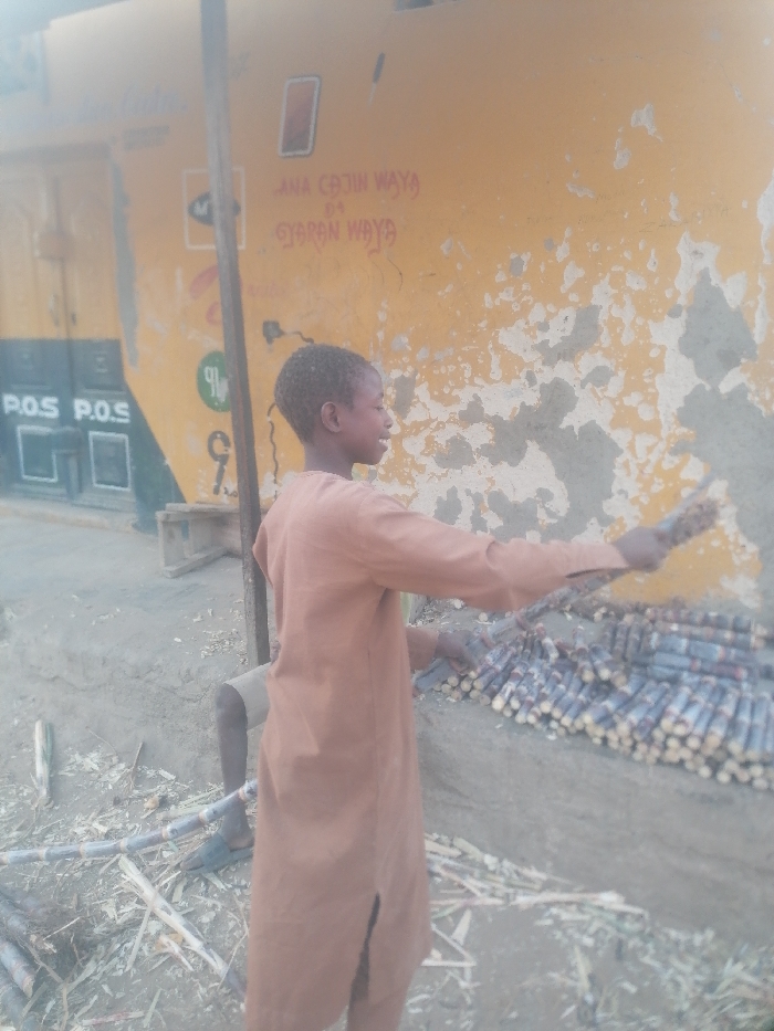 A young boy stands in front of a yellow building holding sugarcane. He wears a long, brown tunic. Piles of harvested sugarcane lie on the ground near him. The building behind him has peeling paint and hand-painted advertisements. Some letters are visible that spell "ANA CAJIN WAYA" and "GYARAN WAYA." Another sign reads "P.O.S." next to a dark doorway. The ground is dusty and sandy. The boy has a thin build with short hair.