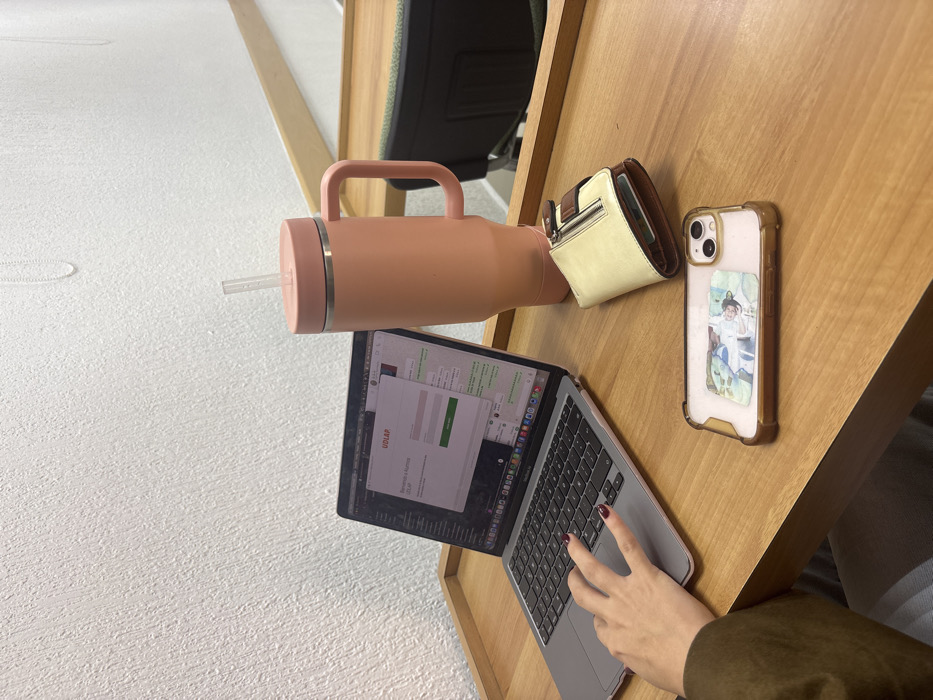 A desk setting features a laptop displaying the "UDIAP" website with a person's hands typing. Next to the laptop sits a peach-colored water bottle, a beige wallet, and an iPhone in a gold case with a cartoon sticker. The desk is made of light wood, and the background includes a white textured wall and what appears to be a piece of furniture with a green cushion.