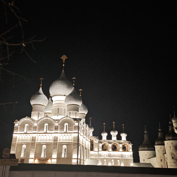 The image displays a brightly illuminated architectural complex at night, dominated by a large, multi-domed Orthodox Christian cathedral. The central structure, rendered in white, features at least five prominent, fluted onion domes topped with golden crosses, and multiple smaller domes and turrets, also crowned with golden crosses. The cathedral's facade is intricately detailed with arched windows and decorative elements, thoroughly lit from below by warm white artificial lighting, causing it to glow against the dark, featureless night sky. To the right of the main cathedral, additional white structures, including a multi-domed bell tower or smaller church and fortified wall sections, are visible, similarly illuminated. A bare tree branch partially extends into the upper left quadrant of the frame. A light-colored, solid wall or barrier occupies the immediate foreground, obscuring the base of the buildings. No individuals are visible in the scene. This architectural complex is identifiable as the Rostov Kremlin, specifically featuring the Assumption Cathedral (Uspensky Sobor) and its adjacent bell tower. This site is located in Rostov Veliky, Yaroslavl Oblast, Russia. The specified location of "Novo-Nikol'skoe, Russia" is historically an older name for Novosibirsk and does not correspond to the architectural features depicted in this image.