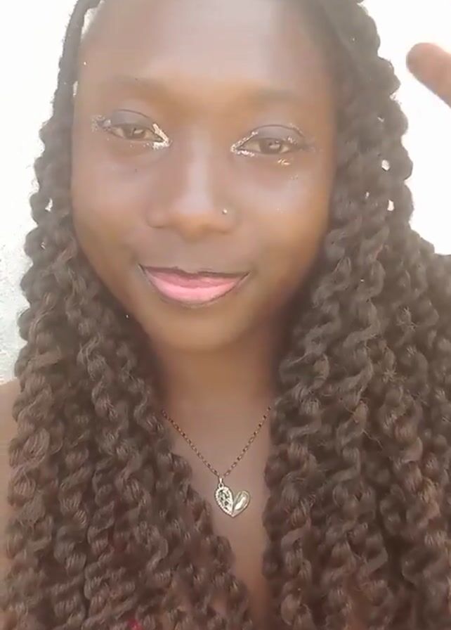 A close-up shot shows a Black woman with long, brown, twisted braids. She is smiling slightly and looking directly at the camera. She wears a gold necklace with a heart-shaped pendant and appears to have glittery makeup around her eyes. She raises her right hand to touch her head. The background is a plain white wall.