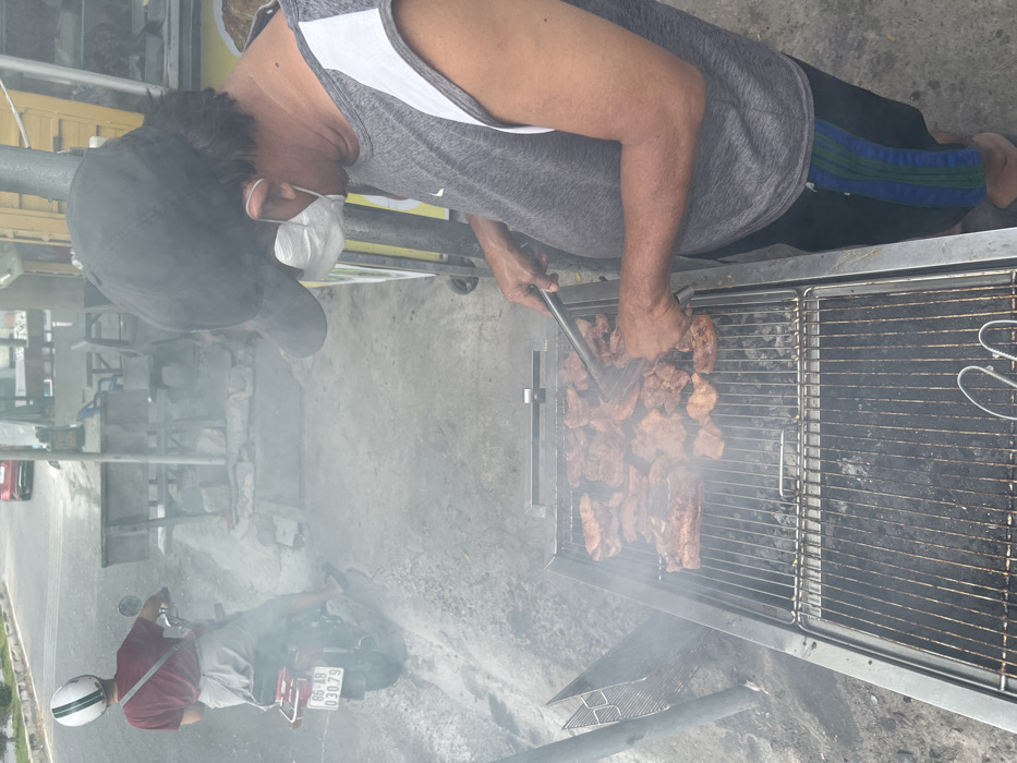 An individual wearing a gray tank top and black cap is grilling meat on a stainless steel grill. The person is also wearing a white face mask and appears to be using tongs to manage the meat. A street scene is visible in the background, with a person on a motorcycle and other street infrastructure. The grill is producing a significant amount of smoke.