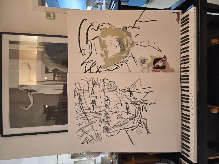 The image displays an interior setting, likely a private residence or studio. In the immediate foreground, a black upright piano is positioned, with its eighty-eight white and black keys spanning the lower third of the frame. Resting directly on the piano keys and extending upwards are two large, unframed artworks on white paper or canvas, placed side-by-side. The left artwork features a gestural black line drawing of a head or face with abstract, scribbled lines. The right artwork presents a similar black line drawing of a head, with the lower facial area filled with a pale olive-green wash. A small, rectangular collage depicting a classical portrait fragment is affixed to the lower-center of this right artwork, surrounded by reddish-brown and white paint marks. Above these two artworks, a large, rectangular black-framed black and white photograph is mounted on a white wall. This photograph depicts a female figure in a light-colored dress, seen from the waist up, with arms raised and hands open in a dynamic pose. Faint outlines of chairs are visible in the background of the photograph. A significant rectangular light reflection obscures part of the upper-right section of this framed piece. To the far left of the framed photograph, a white classical bust sculpture rests on a surface, next to several small, colorful decorative objects. To the far right, a doorway leads into an adjacent room, revealing light blue cabinetry or walls, indicative of a kitchen space. The exact location within the city of Haifa, Israel, cannot be determined from the visual information provided in the image.