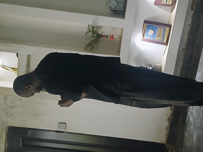 A male individual, with a bald head and beard, stands facing away and slightly to the left, within an indoor setting in Jos, Nigeria