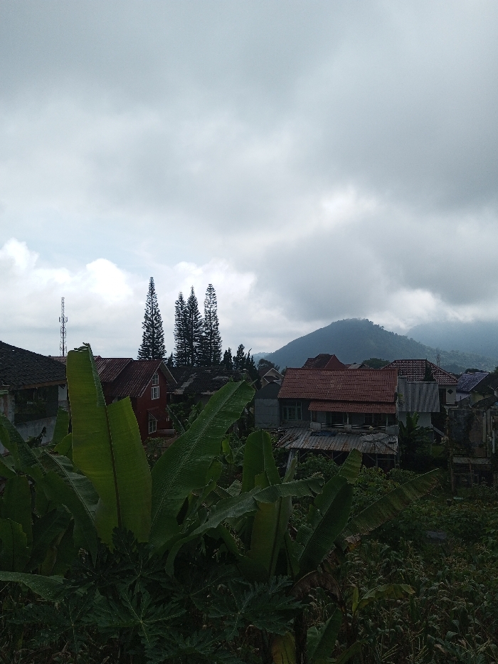 An elevated view depicts a residential area in Kondha, India, under a heavily overcast sky. The foreground is dominated by large, dark green banana leaves with visible moisture droplets, interspersed with other dense green foliage. In the midground, numerous single and multi-story houses are visible, featuring pitched roofs constructed from red clay tiles and corrugated metal. A prominent two-story red house with white-framed windows is situated towards the left-center. To the left, a tall, slender communication tower rises above the rooftops. A cluster of several tall, thin coniferous trees is positioned centrally behind the houses. The background features rolling mountains or hills, partially obscured by clouds or atmospheric haze. No individuals or specific actions are visible within the scene.