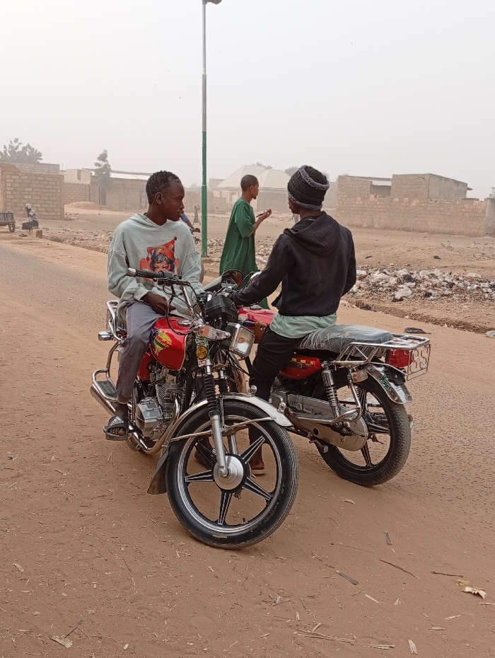 Two young men sit on red motorcycles parked on a dirt road. One wears a light green sweatshirt with a graphic and gray pants. The other wears a dark hooded sweatshirt and a beanie. A third man, wearing a green shirt, stands nearby, possibly using a phone. The background reveals simple brick buildings, a light pole, and scattered debris, all under a hazy sky.