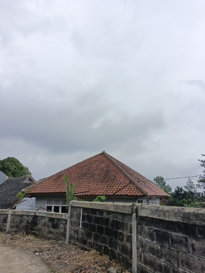 This image displays a static outdoor scene in Kabiufa, Papua New Guinea, under a heavily overcast sky composed of light grey clouds. In the middle ground, a dark grey concrete block wall with a lighter concrete coping extends horizontally across the frame, exhibiting signs of weathering and discoloration. A dirt or gravel path with sparse dry foliage is visible in the immediate foreground, to the left of the wall. Behind the wall, a house with a distinct reddish-orange terracotta tiled hip roof and light-colored walls featuring multiple horizontal windows is centrally positioned. A large green broad-leafed plant grows in front of this house. To the left, a second building with a dark grey tiled roof is partially visible. Green trees and foliage are present in the background on both sides. A single strand of barbed wire is discernible in the upper right portion of the frame. No individuals, animals, or active subjects are depicted within the scene.