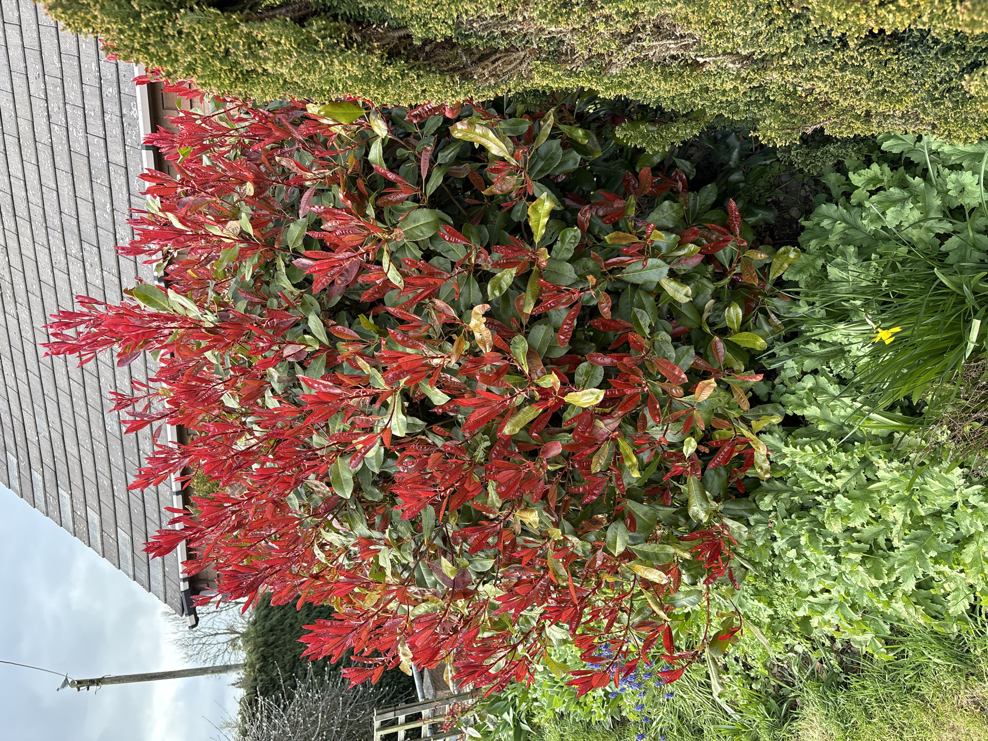 The image captures a vibrant garden scene in Shrewsbury, United Kingdom. A Photinia Red Robin shrub dominates the view with its characteristic red new growth contrasting with older, green foliage. The shrub is positioned adjacent to a grey tiled roof of a building, possibly a house or shed. Behind the Photinia, there is a dense green hedge. To the right, various other plants are visible, including some with larger, light green leaves and a single yellow daffodil among the grass. At the bottom left, a partial view of a wooden fence is discernible. The sky is overcast. A power pole and wires are visible.