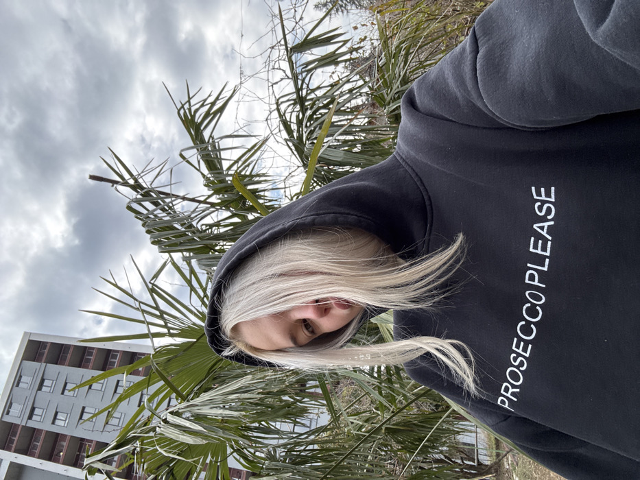 - "An individual with platinum blonde hair, wearing a black hooded sweatshirt embroidered with "PROSECCO PLEASE" in white capital letters, is depicted in an outdoor urban environment in Tbilisi, Georgia" by FM-lu45y2, licensed under CC BY 4.0
