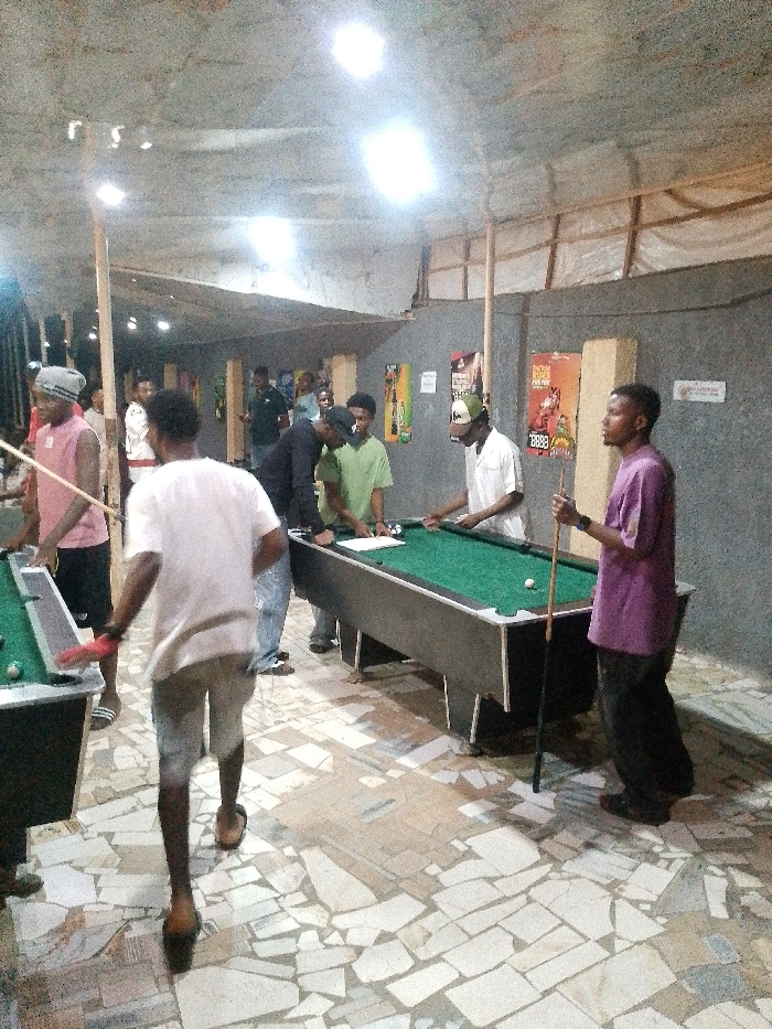 Inside a brightly lit room, several people play pool. Two pool tables stand prominently, one in use and the other waiting. The room's construction reveals beams supporting the ceiling, with posters adorning the walls. A mix of players and spectators are present, some holding pool cues and focusing on the game. The floor is tiled in a unique, abstract pattern.