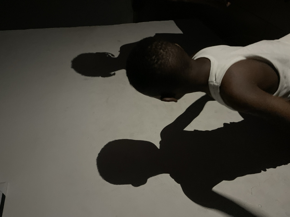 The image captures an indoor scene in Ado, Nigeria, focused on a light-colored wall illuminated by an unseen light source that casts prominent shadows. In the lower right foreground, a young child, exhibiting dark skin and short, dark, textured hair, is viewed from the back. This child wears a white sleeveless undershirt and has their head tilted upwards and slightly to the left. On the adjacent light-colored wall, a large, dark shadow of a child is cast, featuring a head, torso, and outstretched arms. To the upper right of this primary shadow, a smaller, more distant shadow of a third figure, also appearing to be a child, is discernible. The wall exhibits minor textural variations. A small, light-toned object is affixed to the wall near the upper left corner. The far right side of the frame transitions into a dark, indistinct area, indicating a corner or an unlit section of the room.