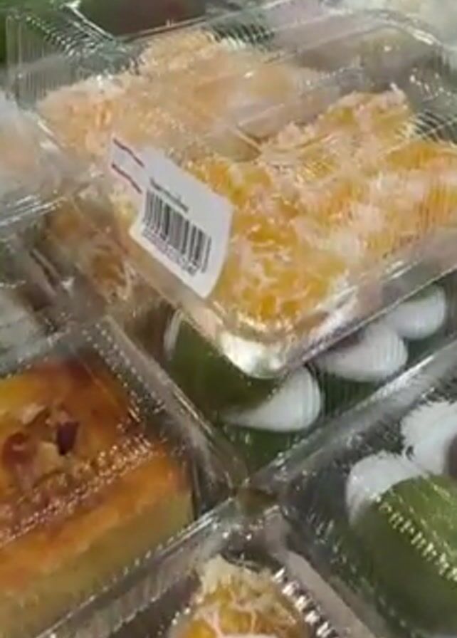 variety of Thai desserts packaged in clear plastic containers. The desserts have various colors and textures, including orange sweets covered in coconut flakes, and green, purple, and white desserts stacked on top of each other.