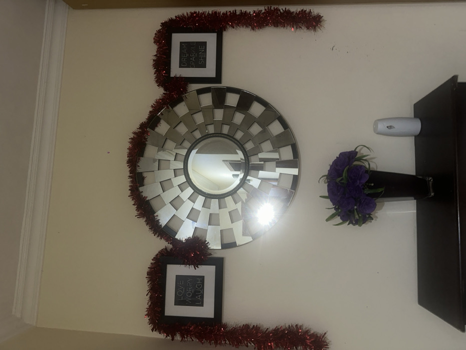 A wall displays a round, segmented mirror, flanked by two framed prints reading "Dream Sparkle Shine" and "Love Worry Laugh" respectively. Red tinsel intertwines around the decor. To the right, a shelf holds a vase of purple flowers and an air freshener. The wall is a light beige color.