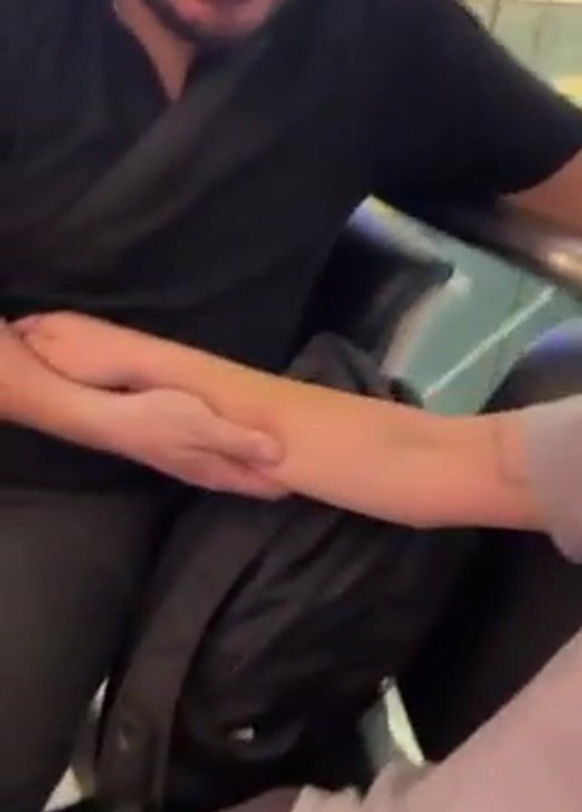 A man in a black long-sleeved shirt holds the forearm of a person wearing a light purple t-shirt